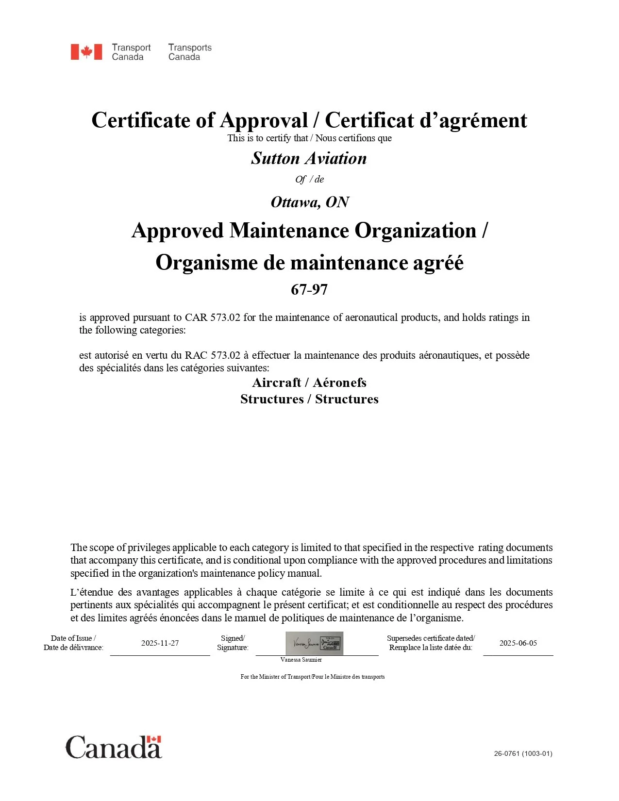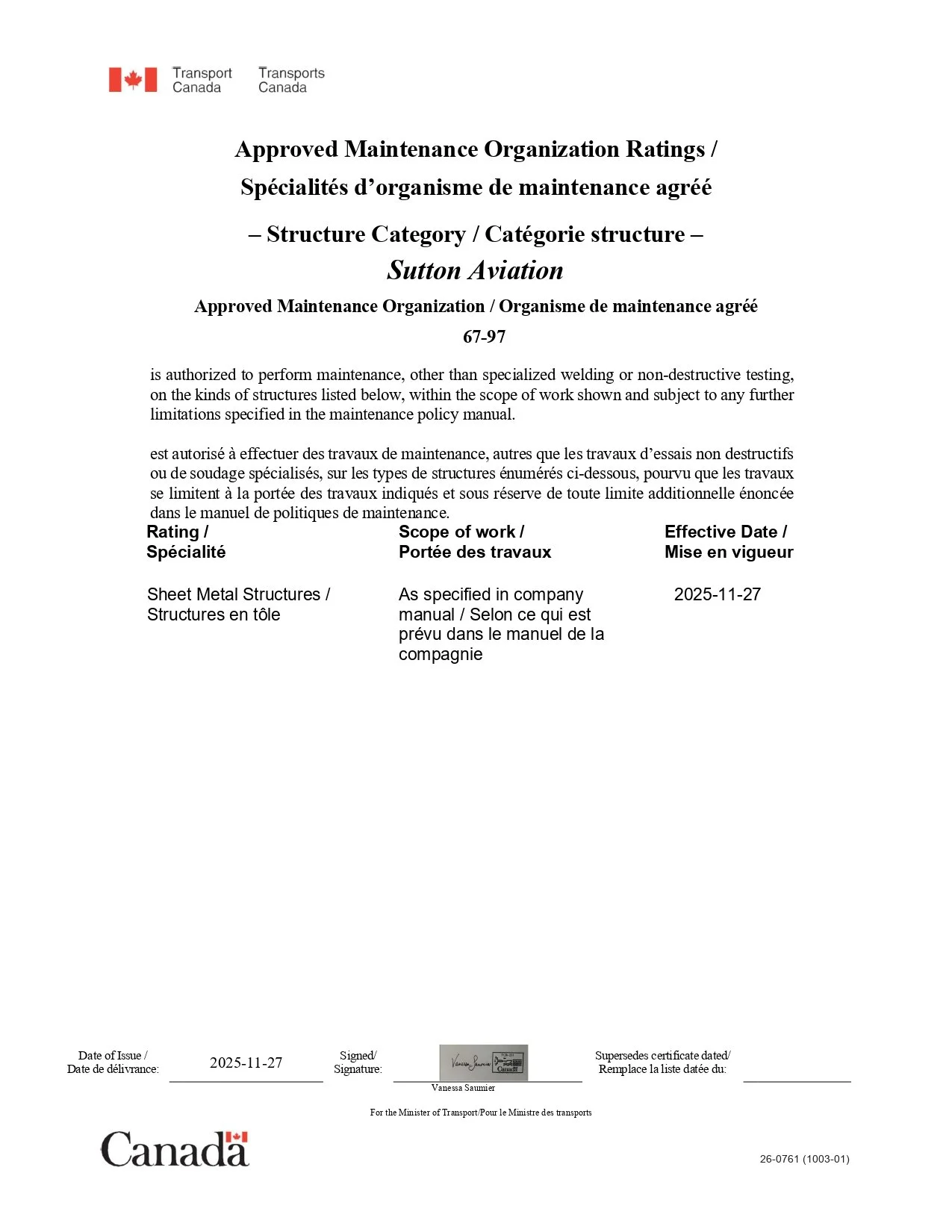 Sutton Aviation AMO#67-97 is approved by Transport Canada as an aircraft maintenance and structural repair facility. Our practices, policies and procedures ensure your aircraft is maintained, overhauled and repaired to the highest global standards. We take pride in leading the industry with exceptional standards, uncompromising safety and responsive service across both commercial and private aviation sectors.